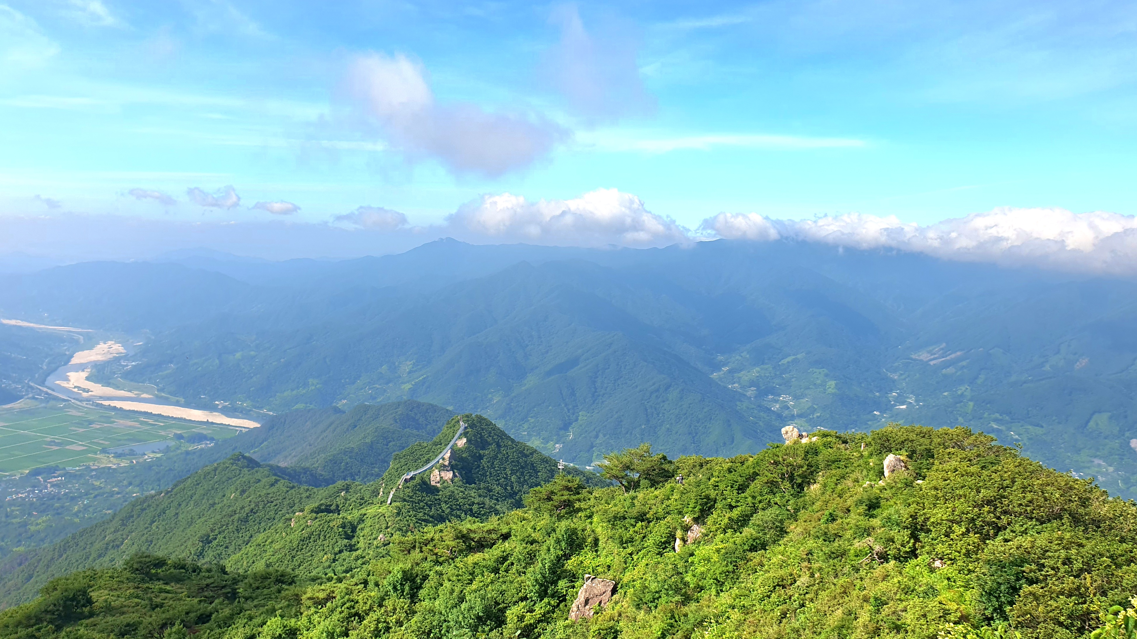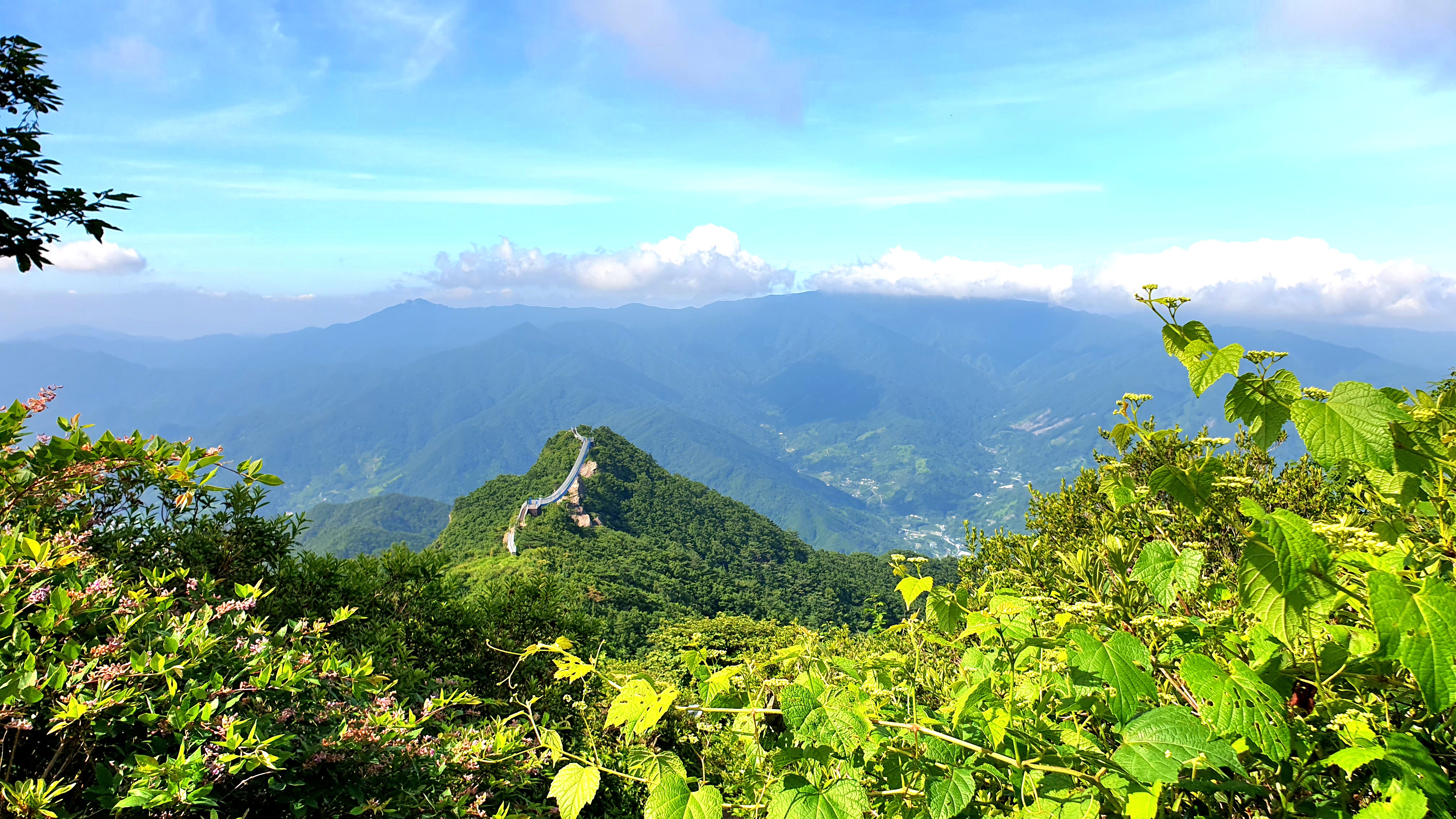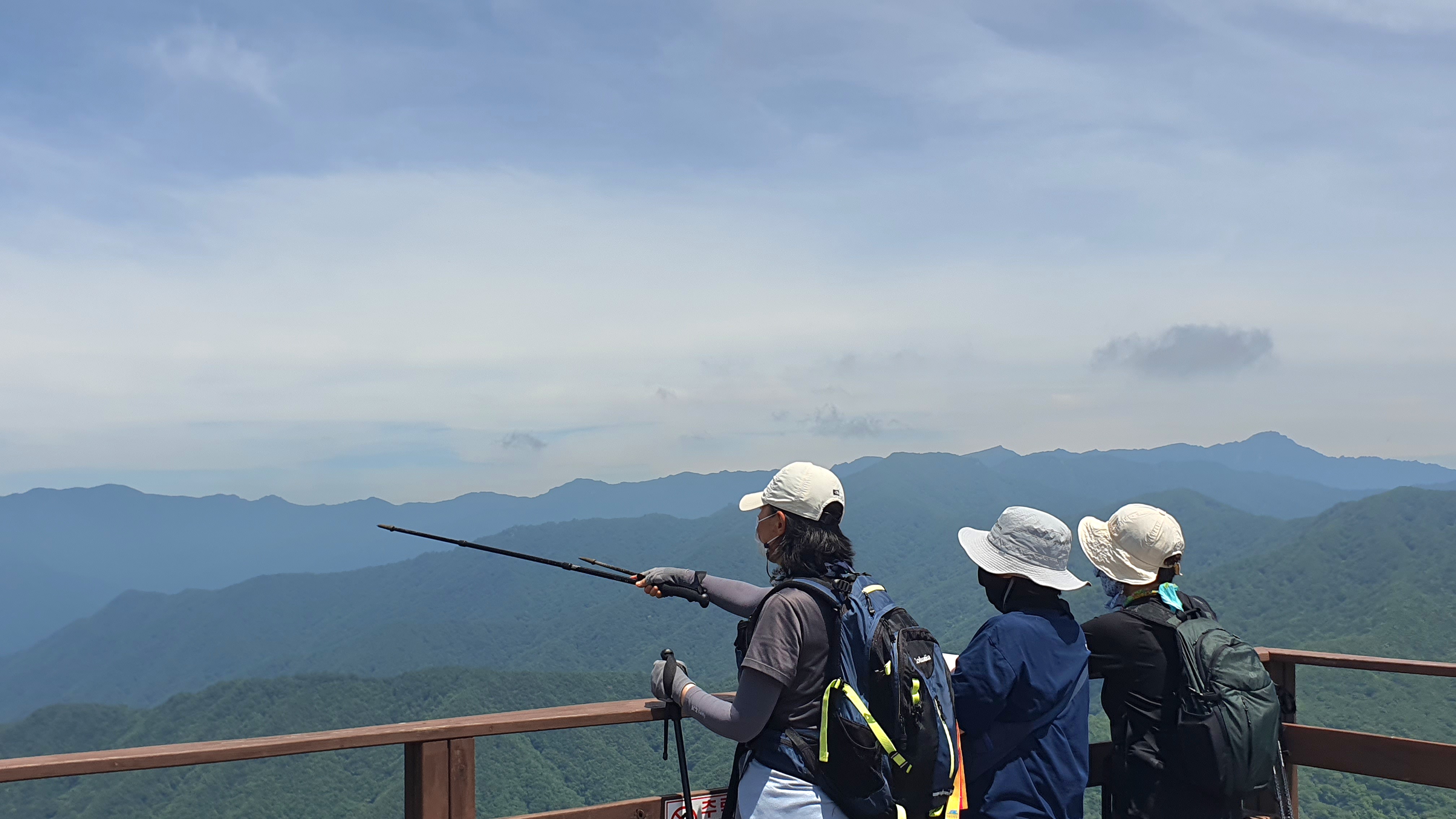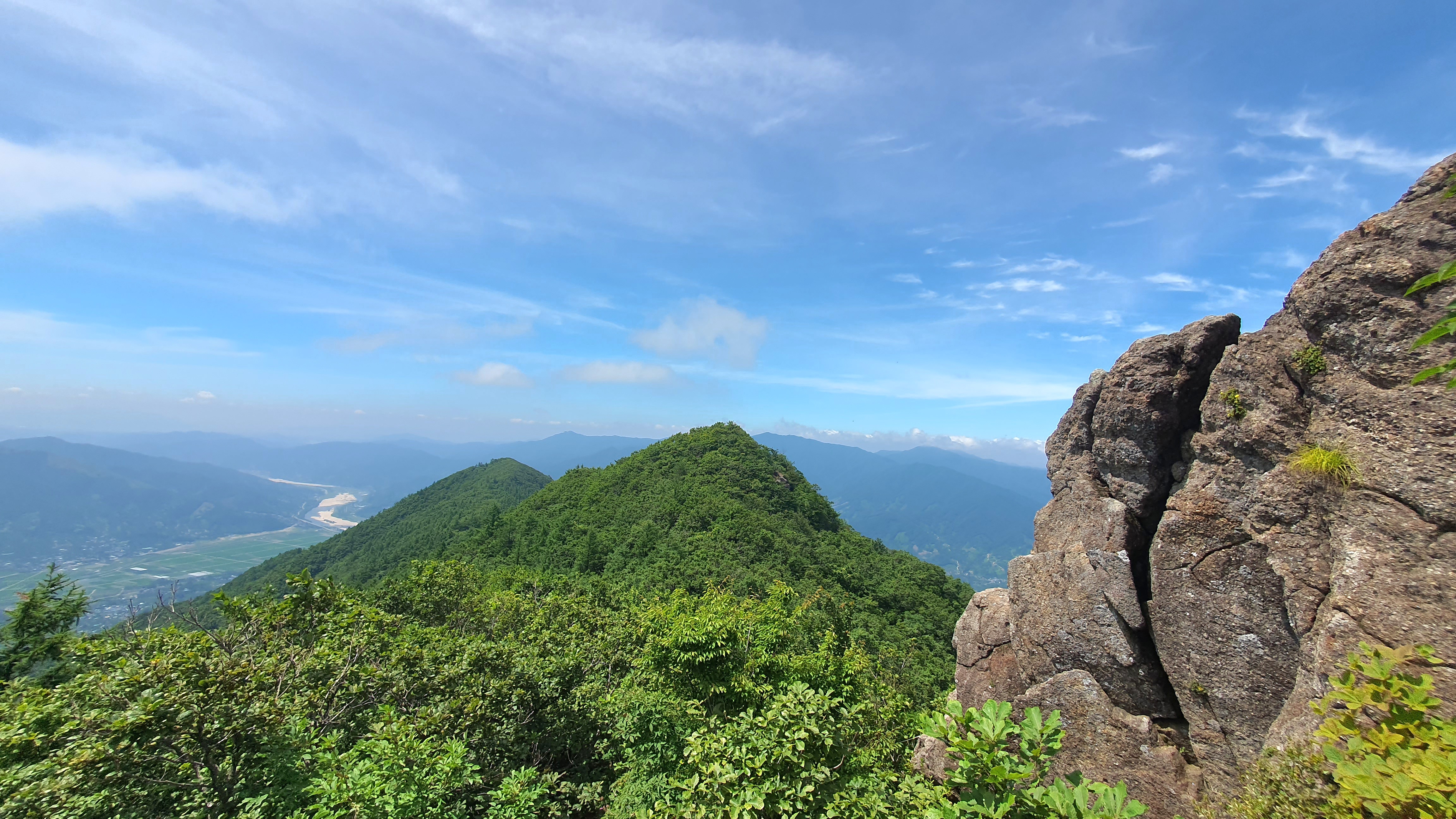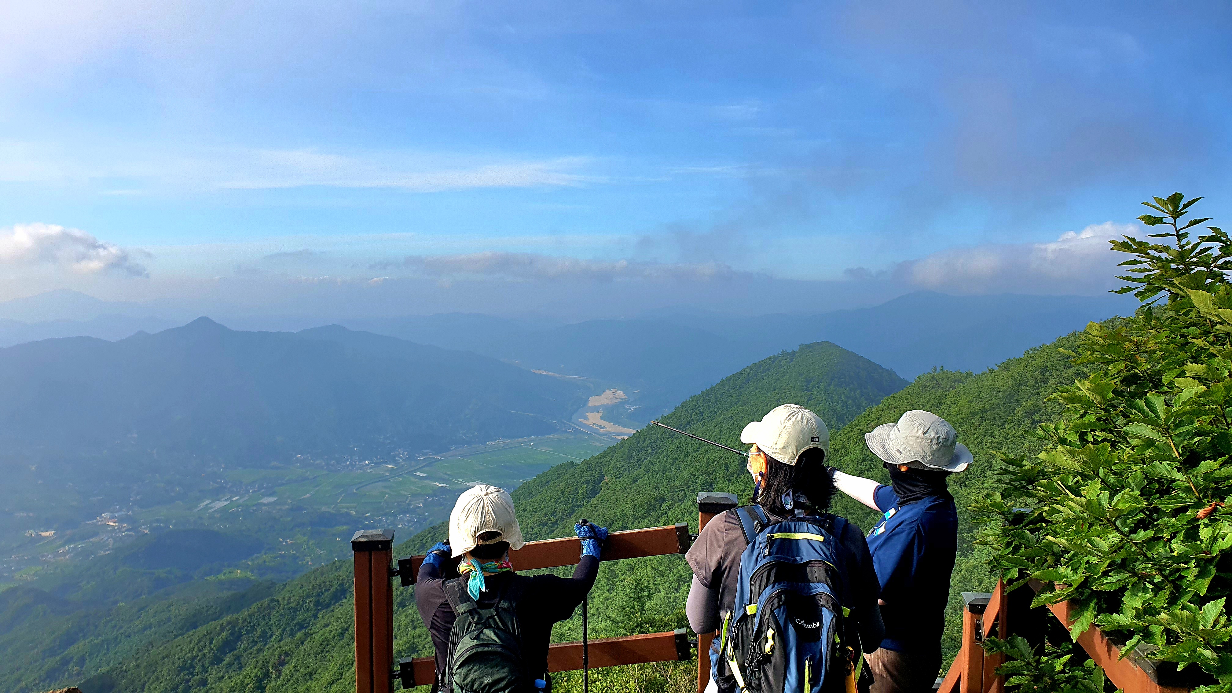우측으로 축지리, 정동리, 중대리, 동매리, 등촌리를 지나 회남재로 향하는 계곡이 세찬 바람에 일구어내는 흰구름 군무가 발아래로 펼쳐 보인다.