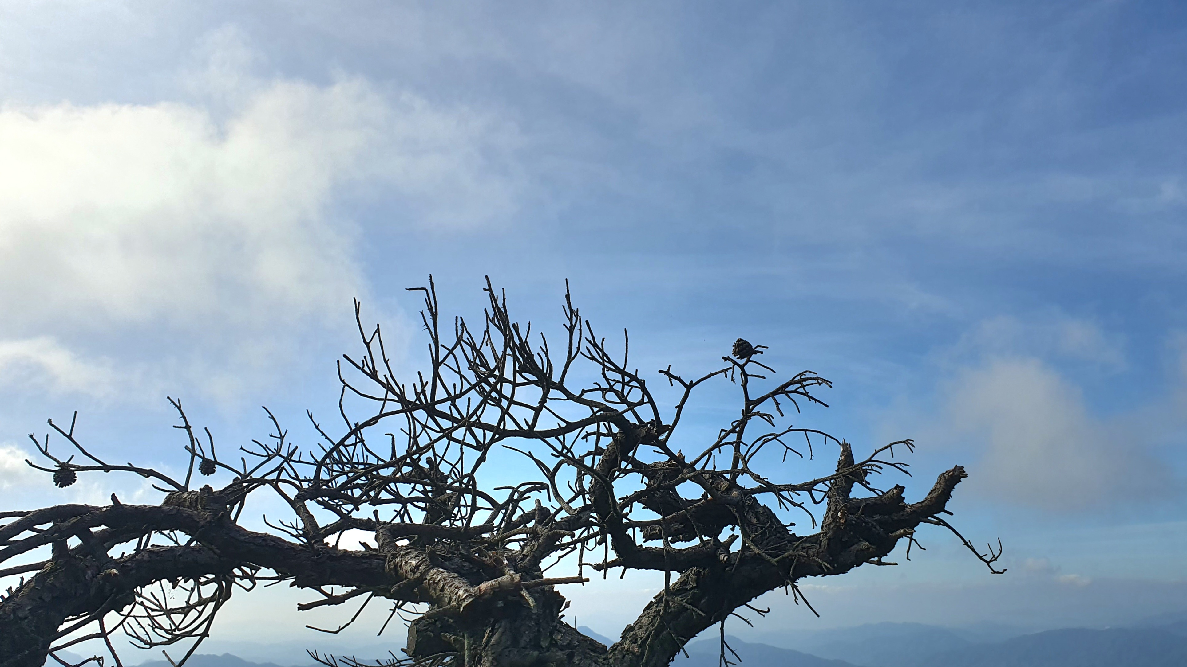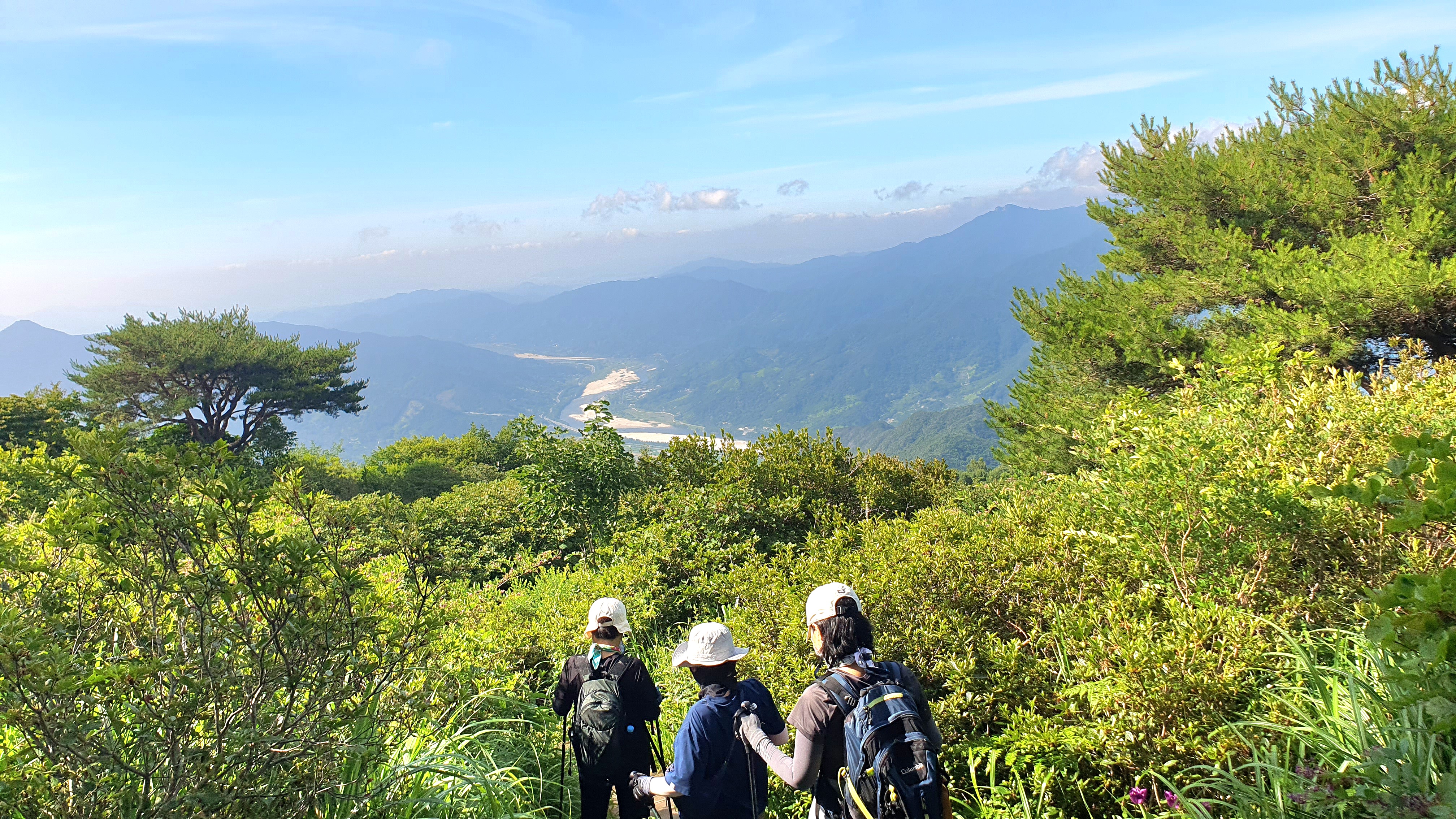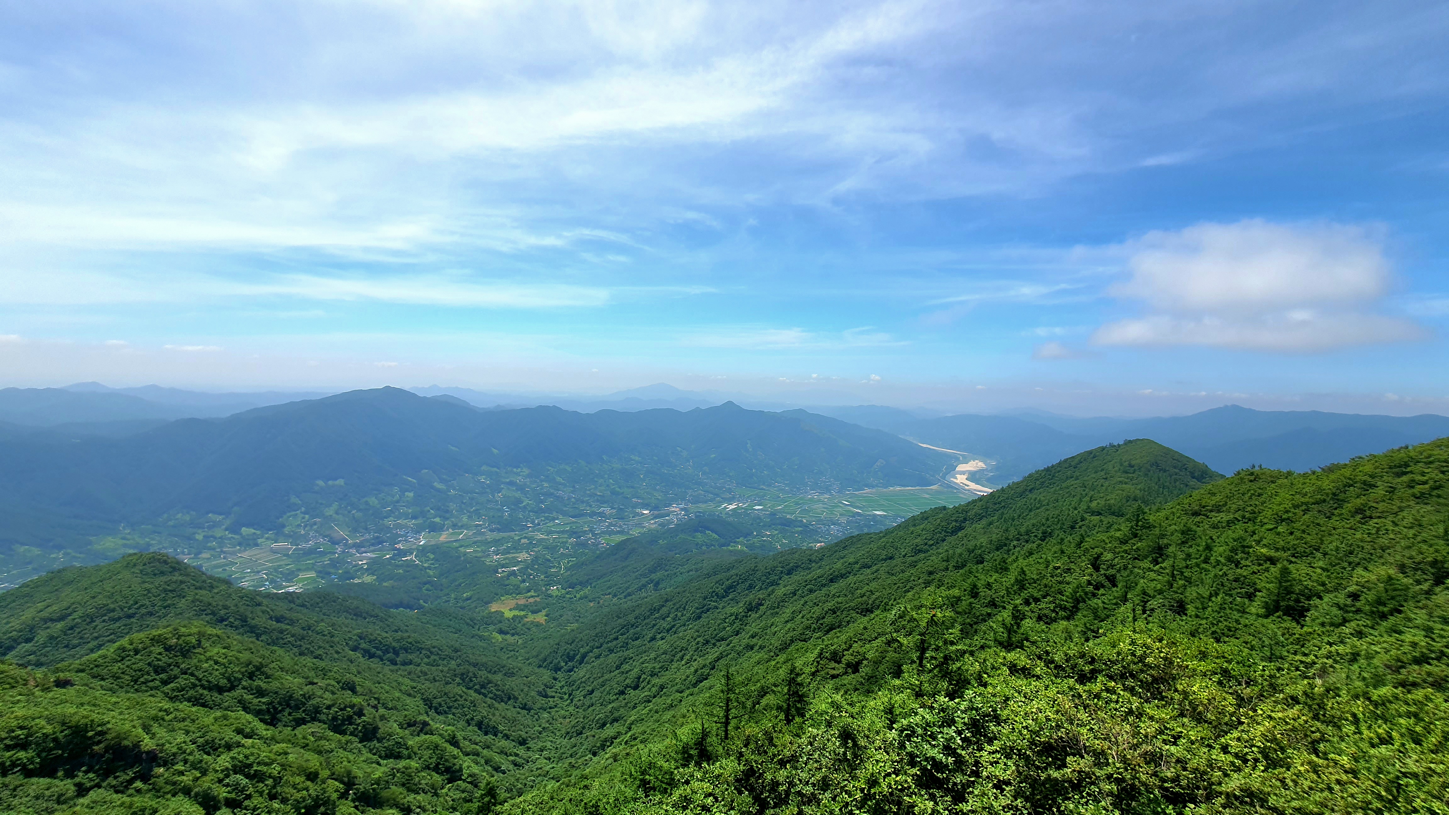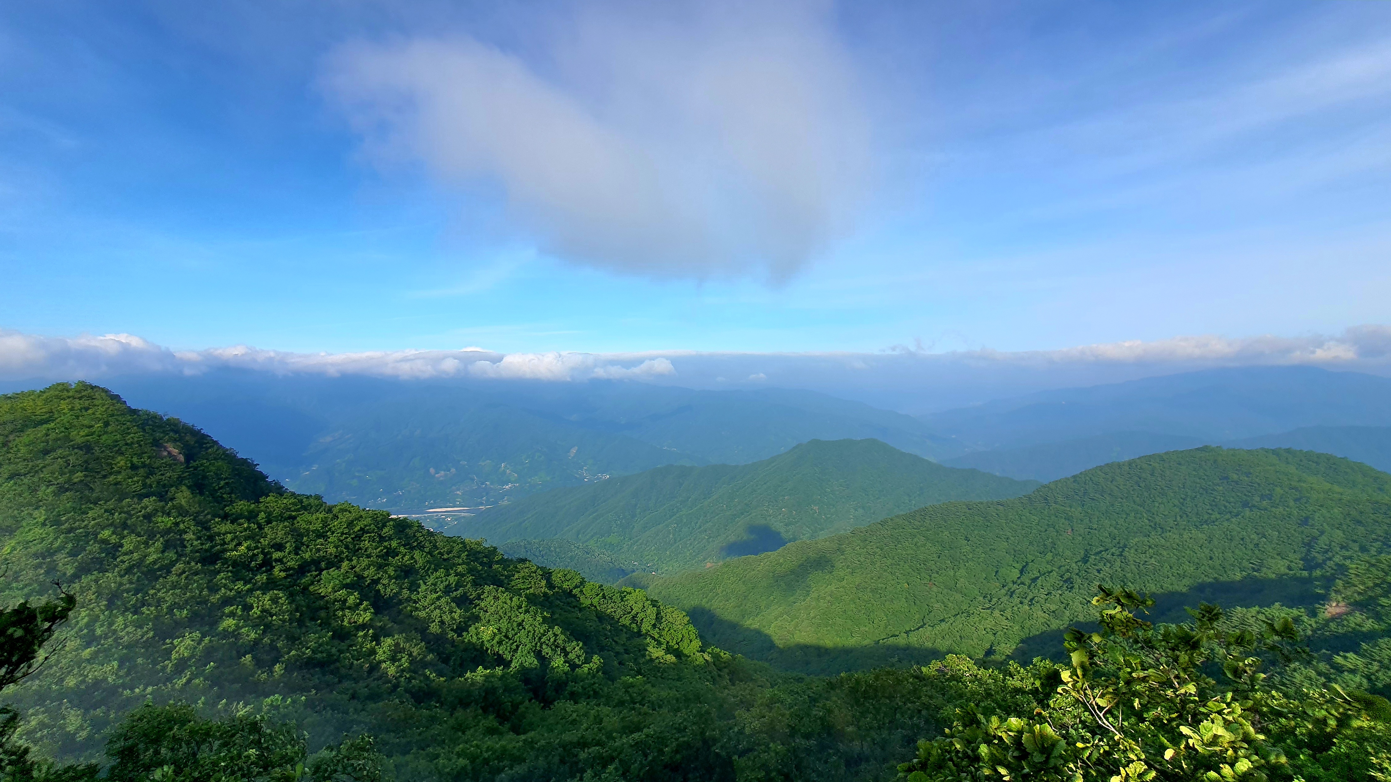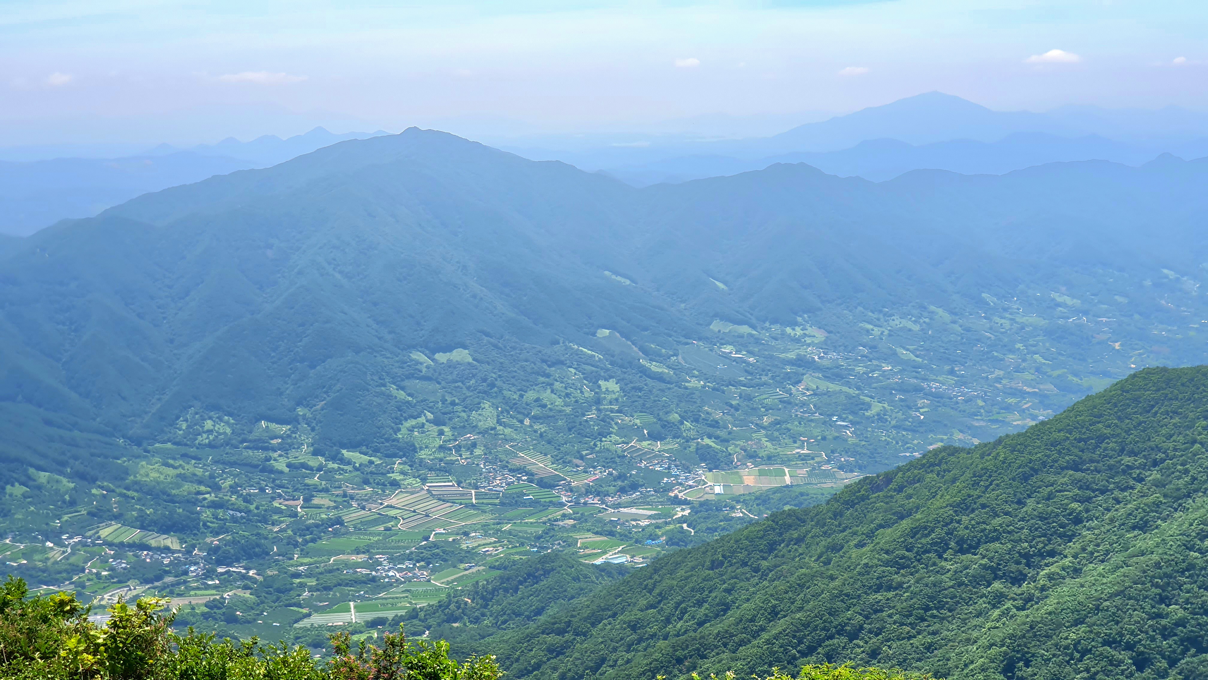 우측으로 축지리, 정동리, 중대리, 동매리, 등촌리를 지나 회남재로 향하는 계곡이 세찬 바람에 일구어내는 흰구름 군무가 발아래로 펼쳐 보인다.