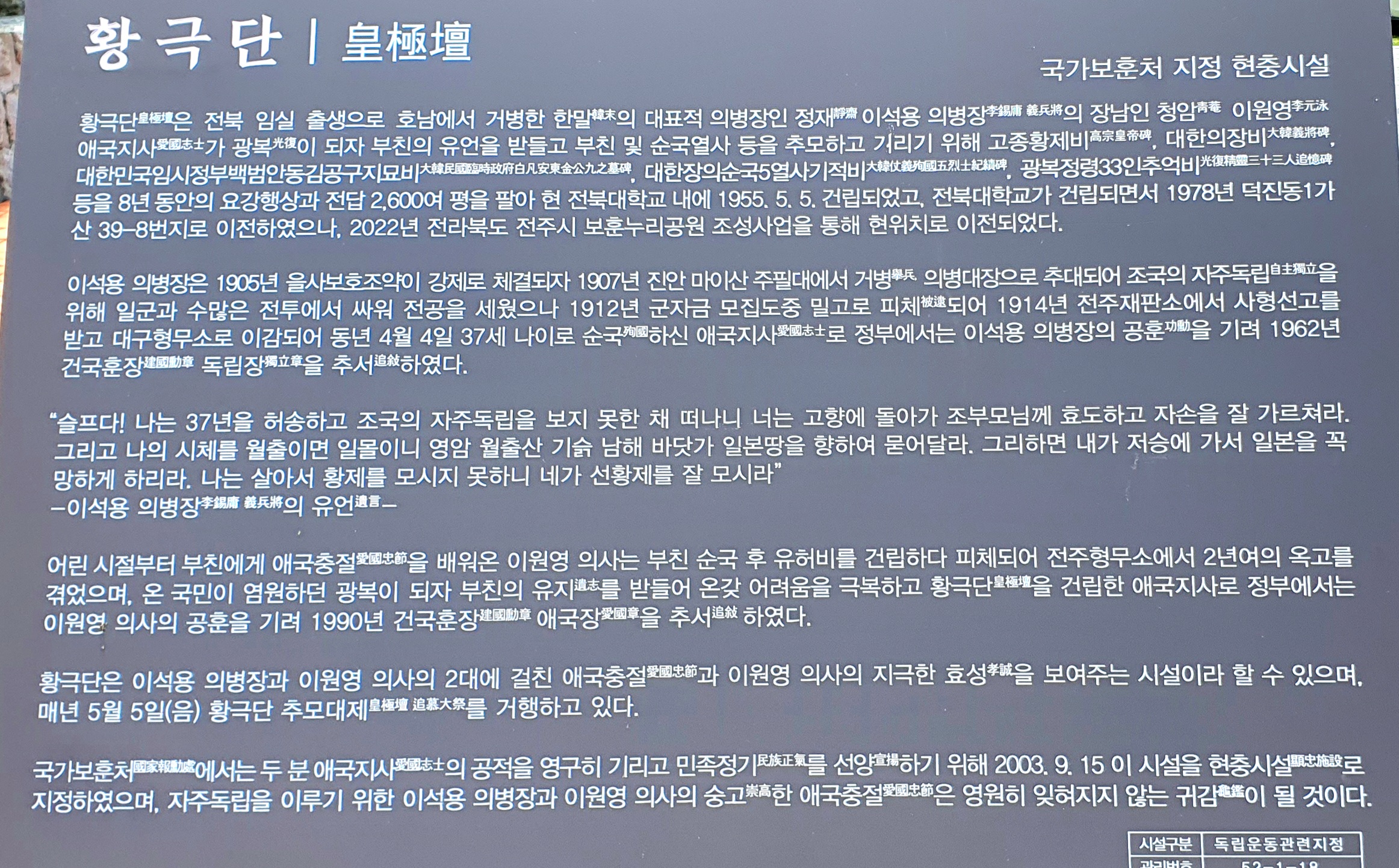 황극단皇極壇은 전북 임실 출생으로 호남에서 거병한 한말韓末의 대표적 의병장인 정재精齋 이석용 의병장李錫庸 義兵將의 장남인 청암靑庵 이원영李元永 애국지사愛國志士가 광복光復이 되자 부친의 유언을 받들고 부친 및 순국열사 등을 추모하고 기리기 위해 고종황제비高宗皇帝碑, 대한의장비大韓義將碑, 대한민국임시정부백범안동김공구지묘비大韓民國臨時政府金公九之墓碑, 대한장의순국5열사기적비大韓仗義殉國五烈士記積碑, 광복정령33인추억비光復精靈三十三人追憶碑 등을 8년 동안의 요강행상과 전답 2,600여 평을 팔아 현 전북대학교 내에 1955. 5. 5. 건립되었고, 전북대학교가 건립되면서 1978년 덕진동1가 산 39-8번지로 이전하였으니, 2022년 전라북도 전주시 보훈누리공원 조성사업을 통해 현위치로 이전되었다.