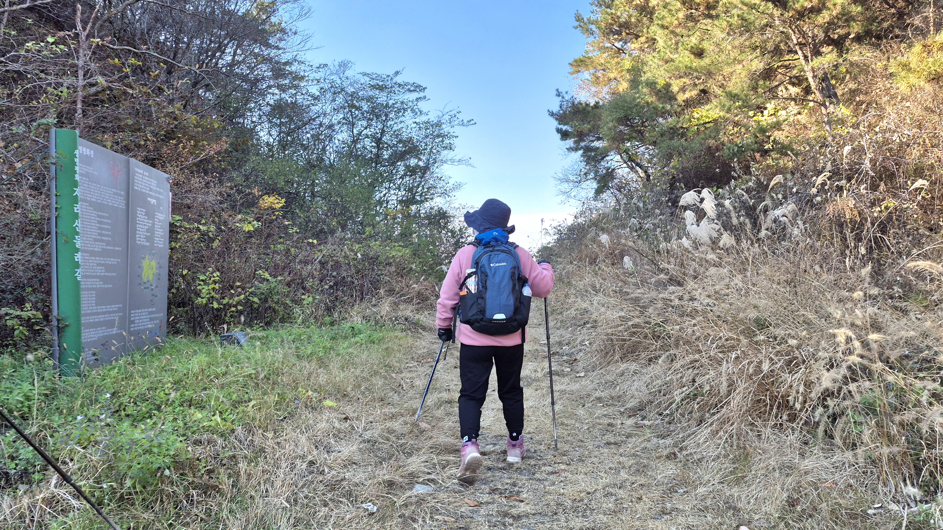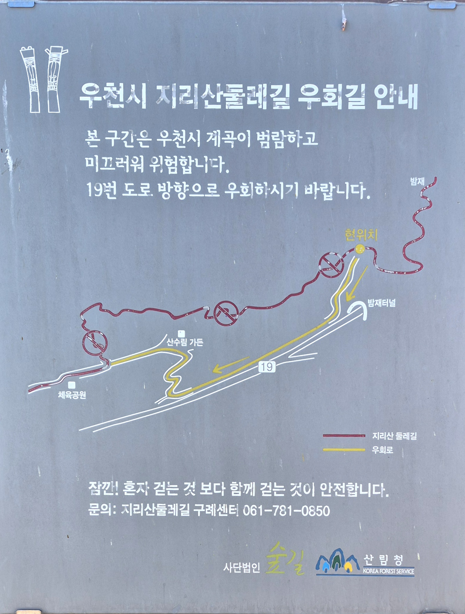 13:32 지리산둘레길 남원 방향 밤재에서 출발13:40 임도에 겹치는 삼거리 : 주천 6.4km, 산동 9.5km14:14 산업로 하행선 : 주천 4.5km, 산동 11.4km14:17 지리산유스캠프 : 주천 4.2km, 산동 11.7km14:21 산업로 하행