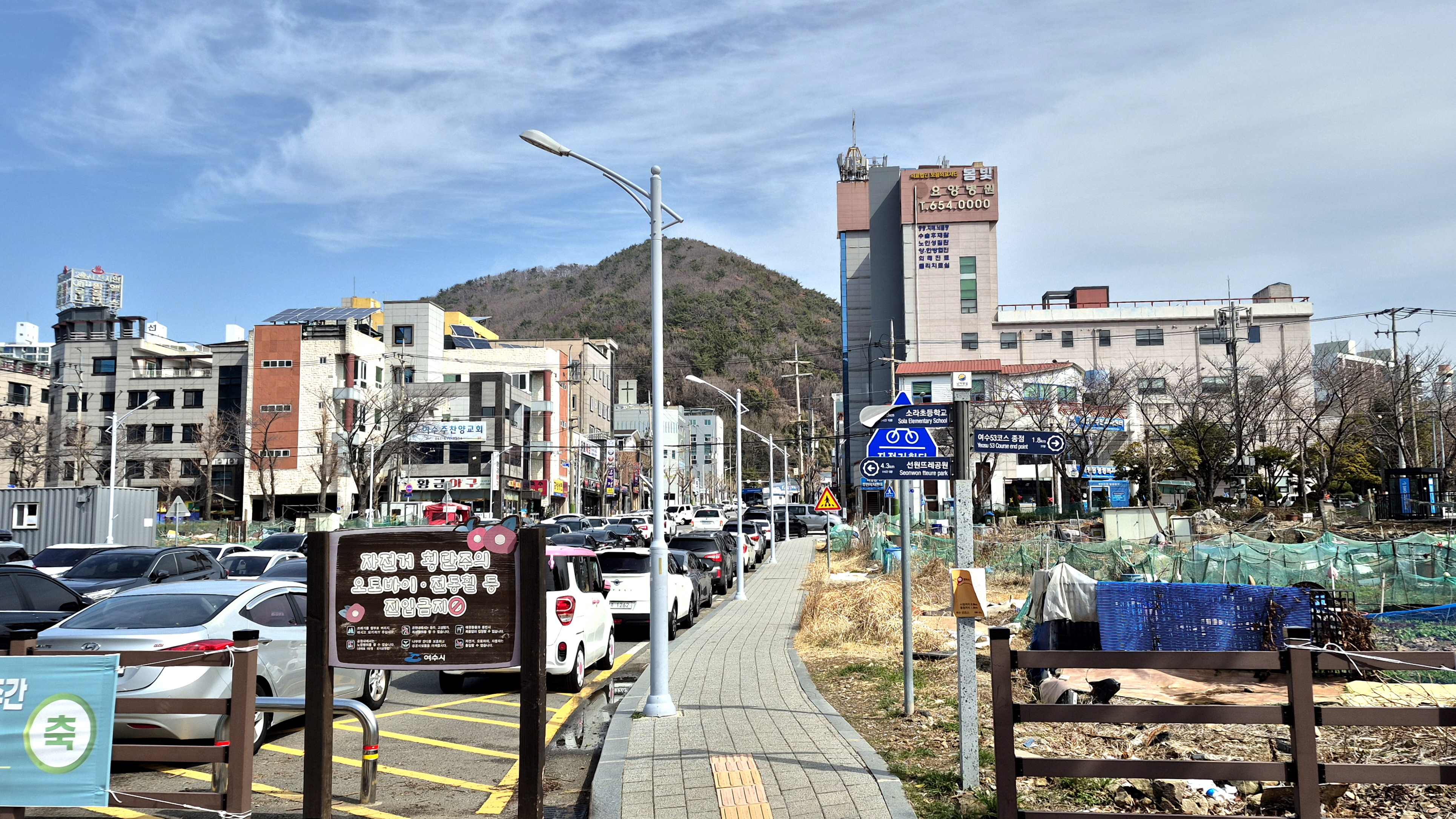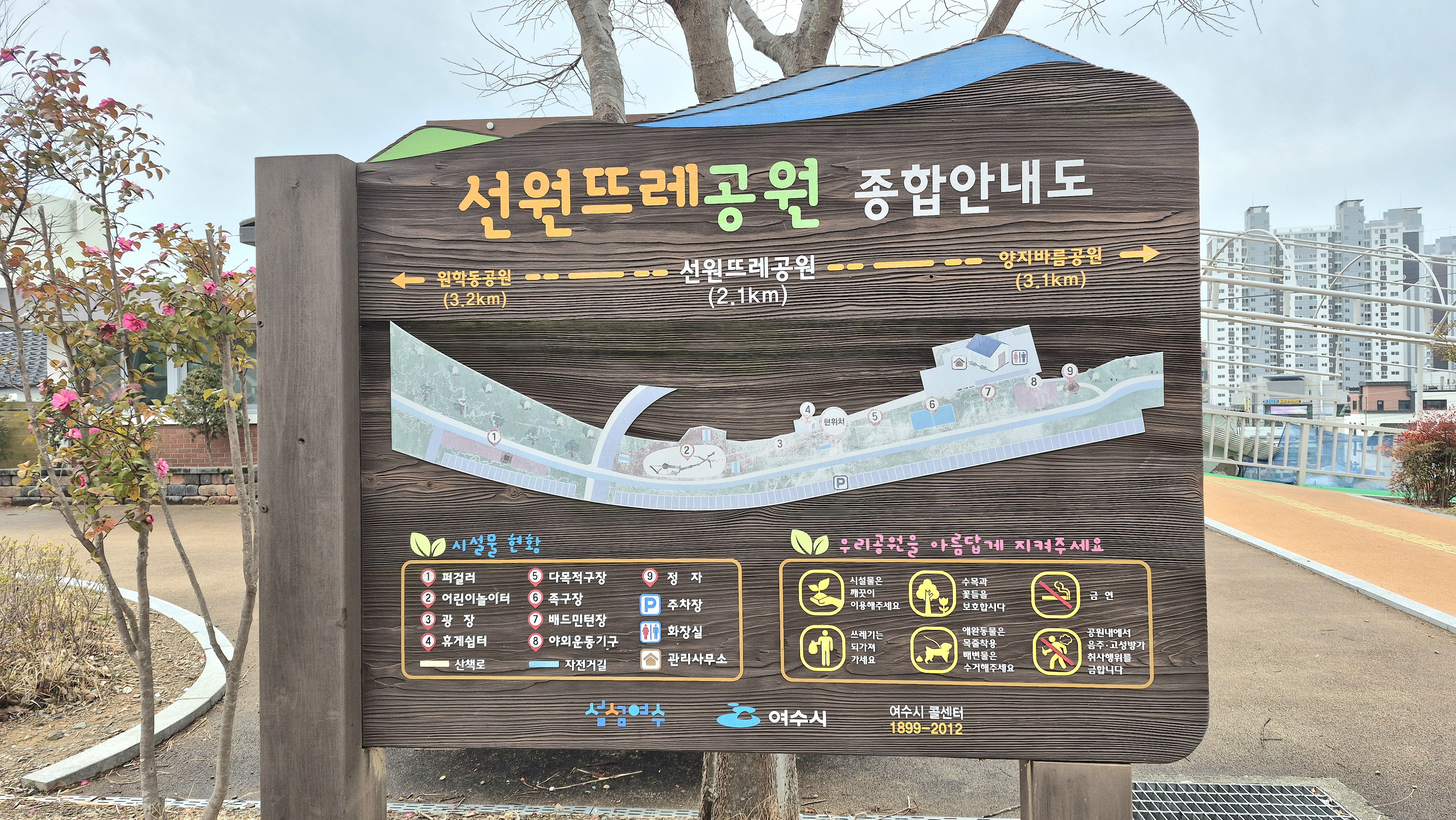 08:32 6분여 걸어나오니 52코스에서 덕양곱창골목으로 가는 양지바름공원 길이 나오며 선원뜨레공원과 미평공원으로 이어지는 옛철을 따라 종점인 여수종합버스터미널 400m 전까지 밴프路로 이어진다