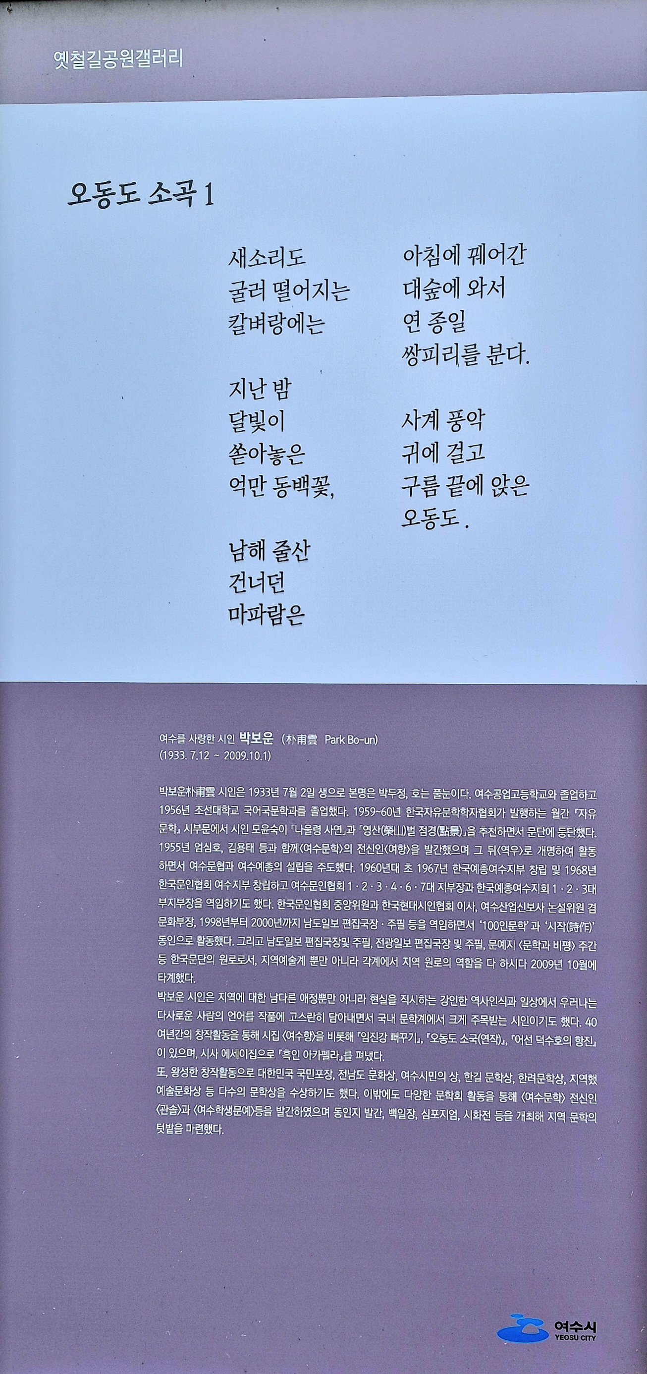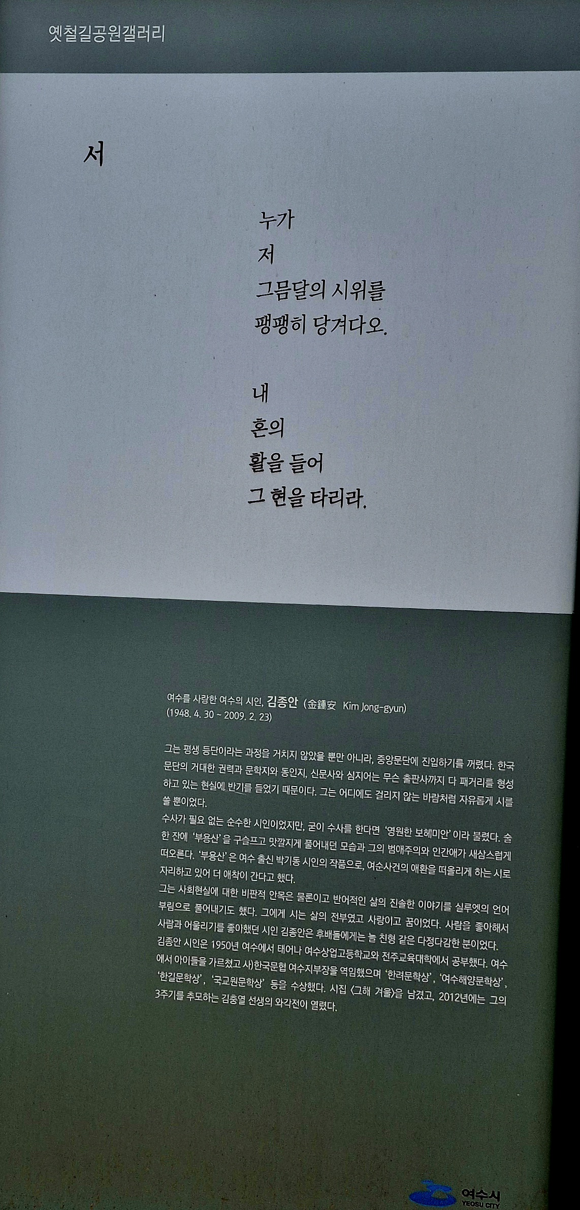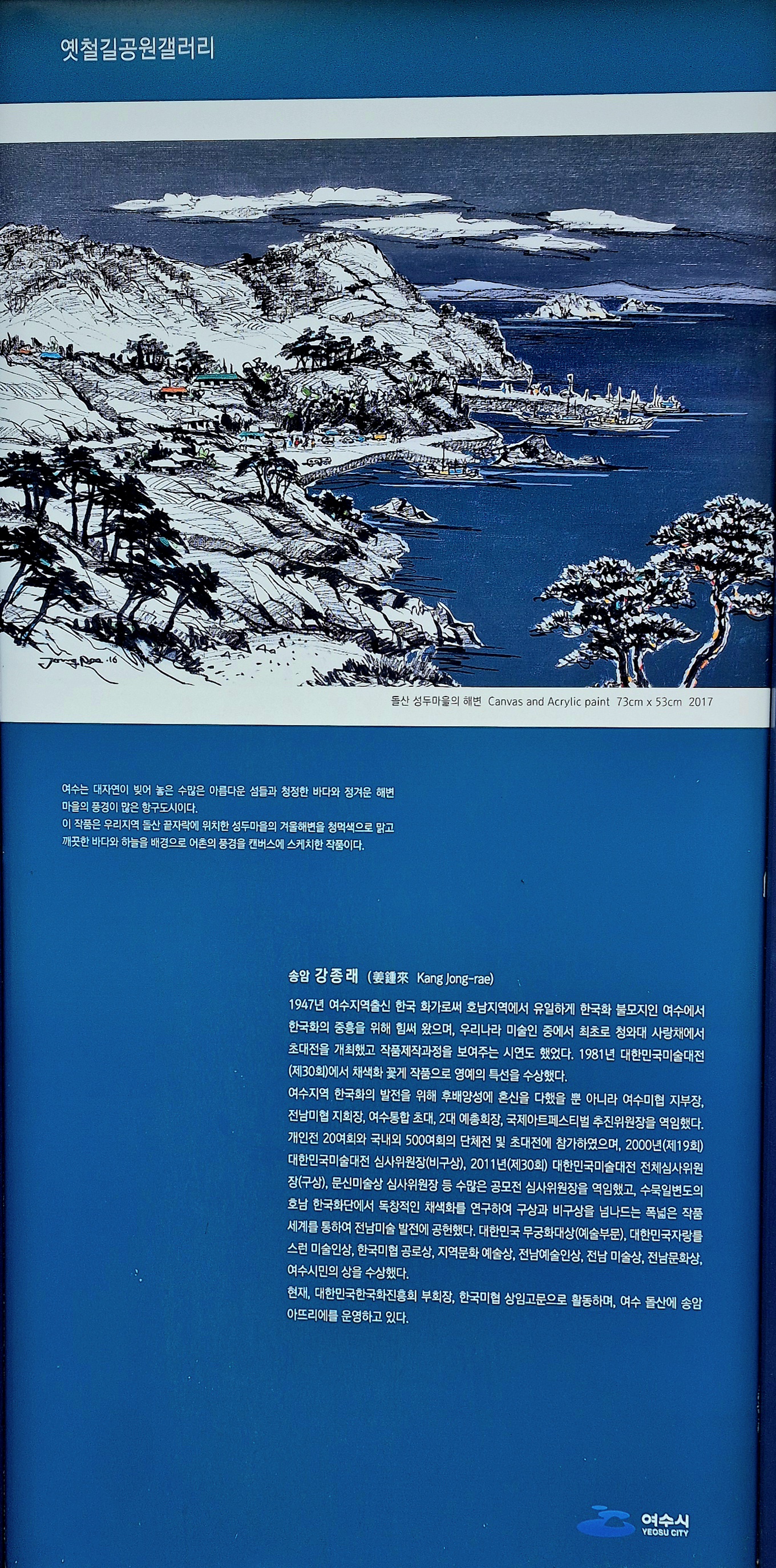 이번에 조성된 옛철길공원 갤러리는 여수 예슬인들의 작품을 설치하여 여수시민에게 지역 에슬인들의 작품을 감상하는 기희를 제공하고 예술이 숨쉬는 문화도시로서의 자긍심을 고취하고자 여수시가 주관하고 아르블루조형연구소가 작품 설치를 진행했다.