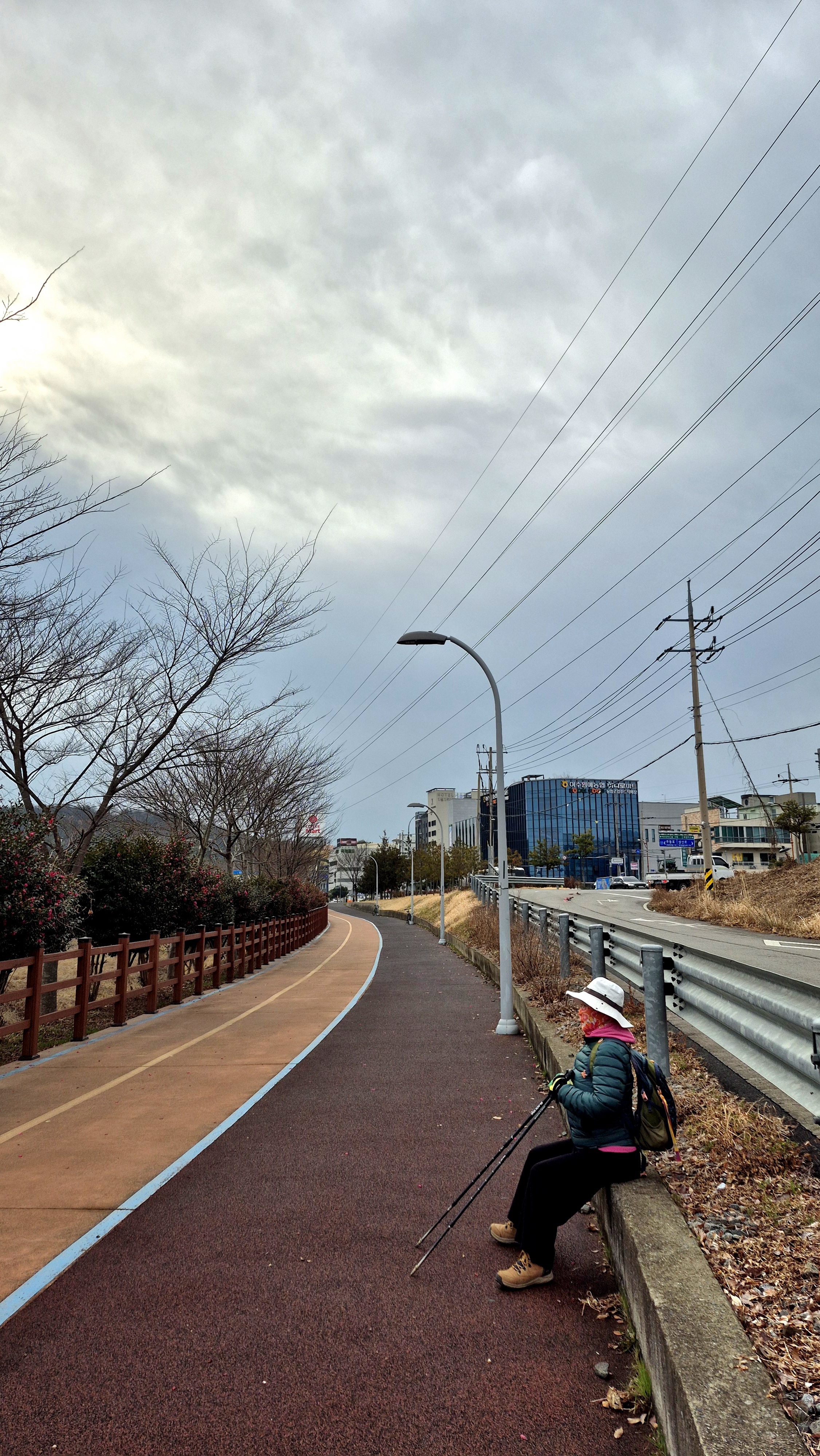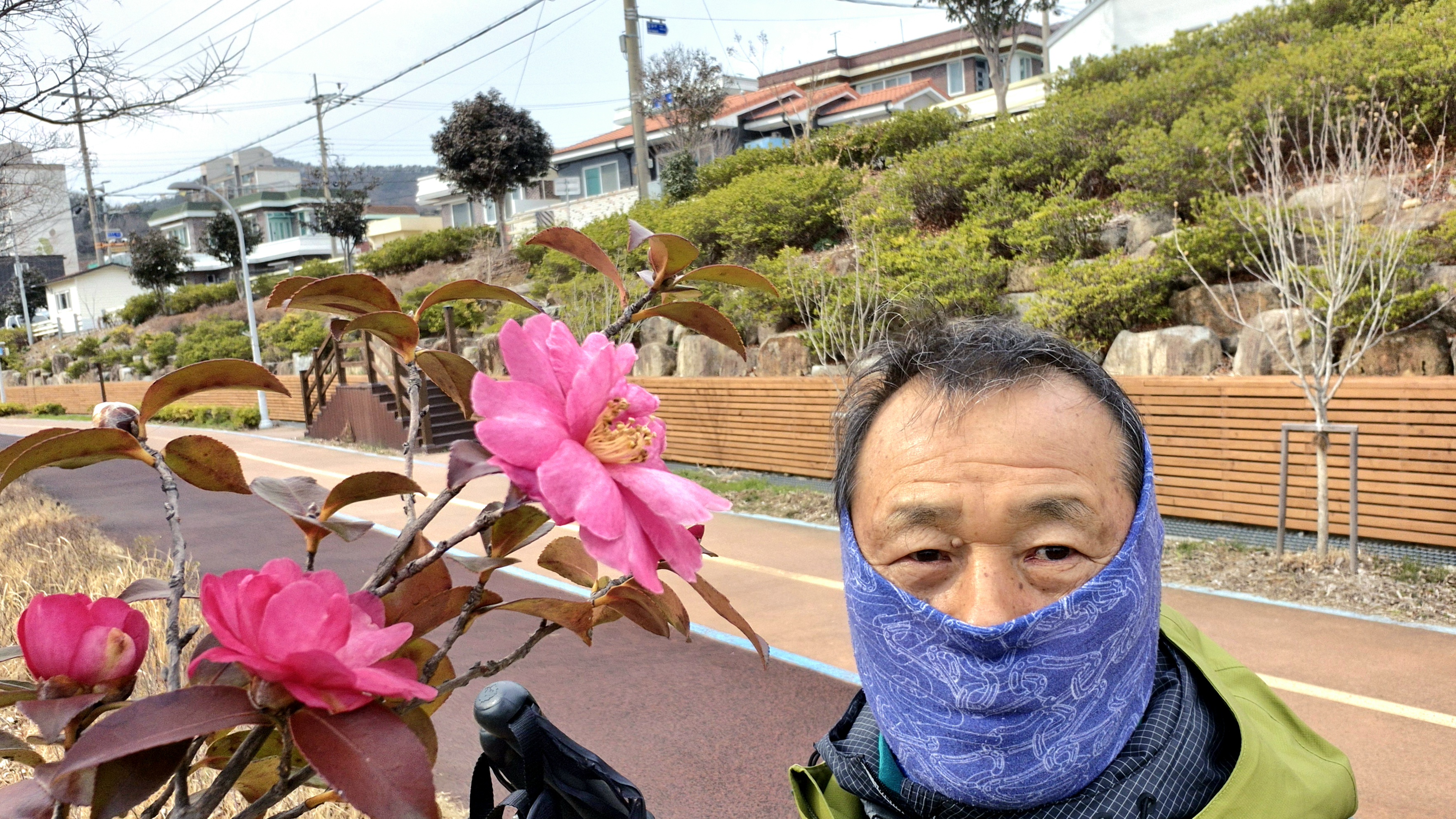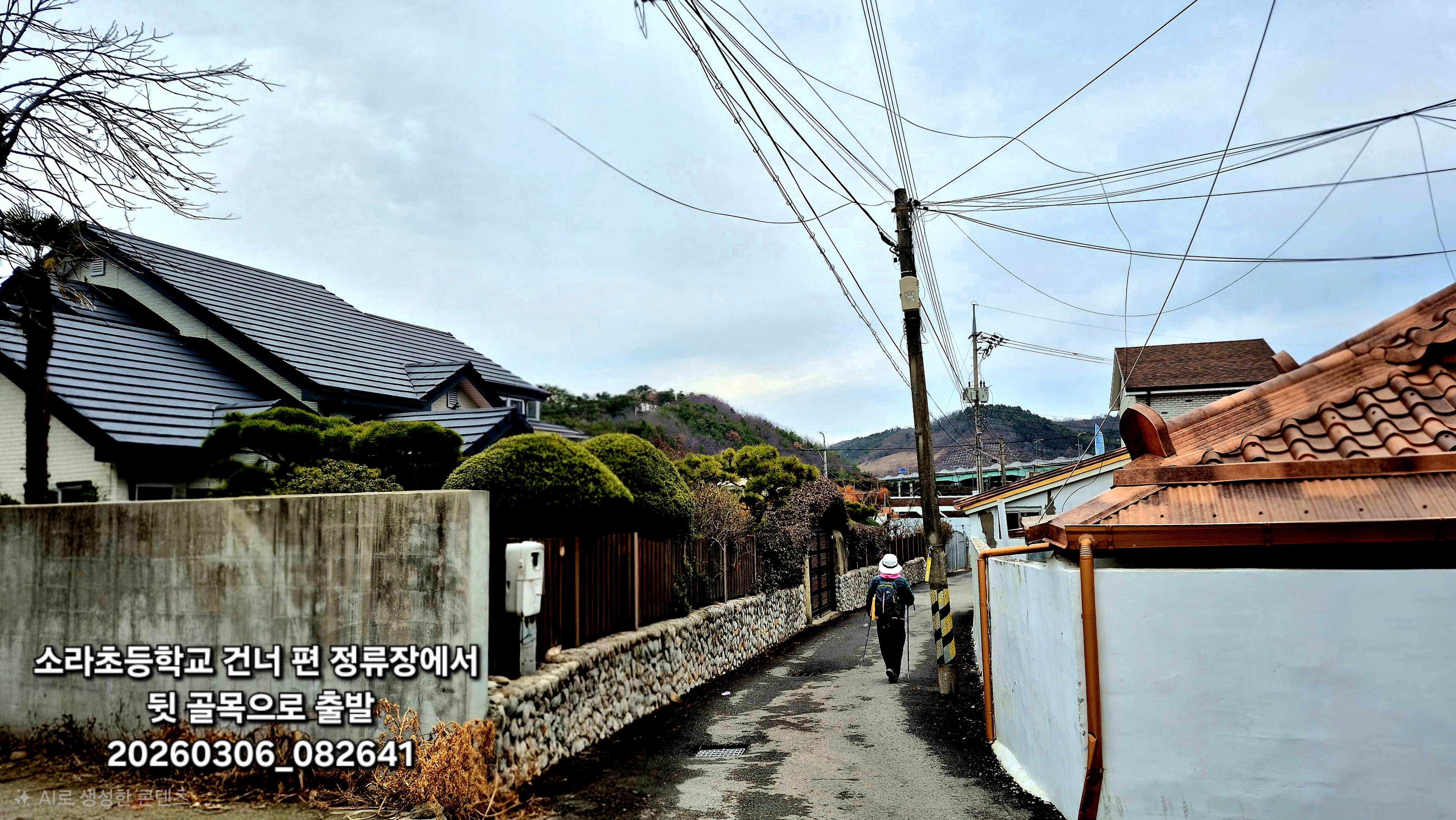 08:26 소라초등학교 건너 편 정류장에서 뒷 골목으로 출발: 오늘은 쌀쌀한 날씨에 바라이 약간 세게 불었다