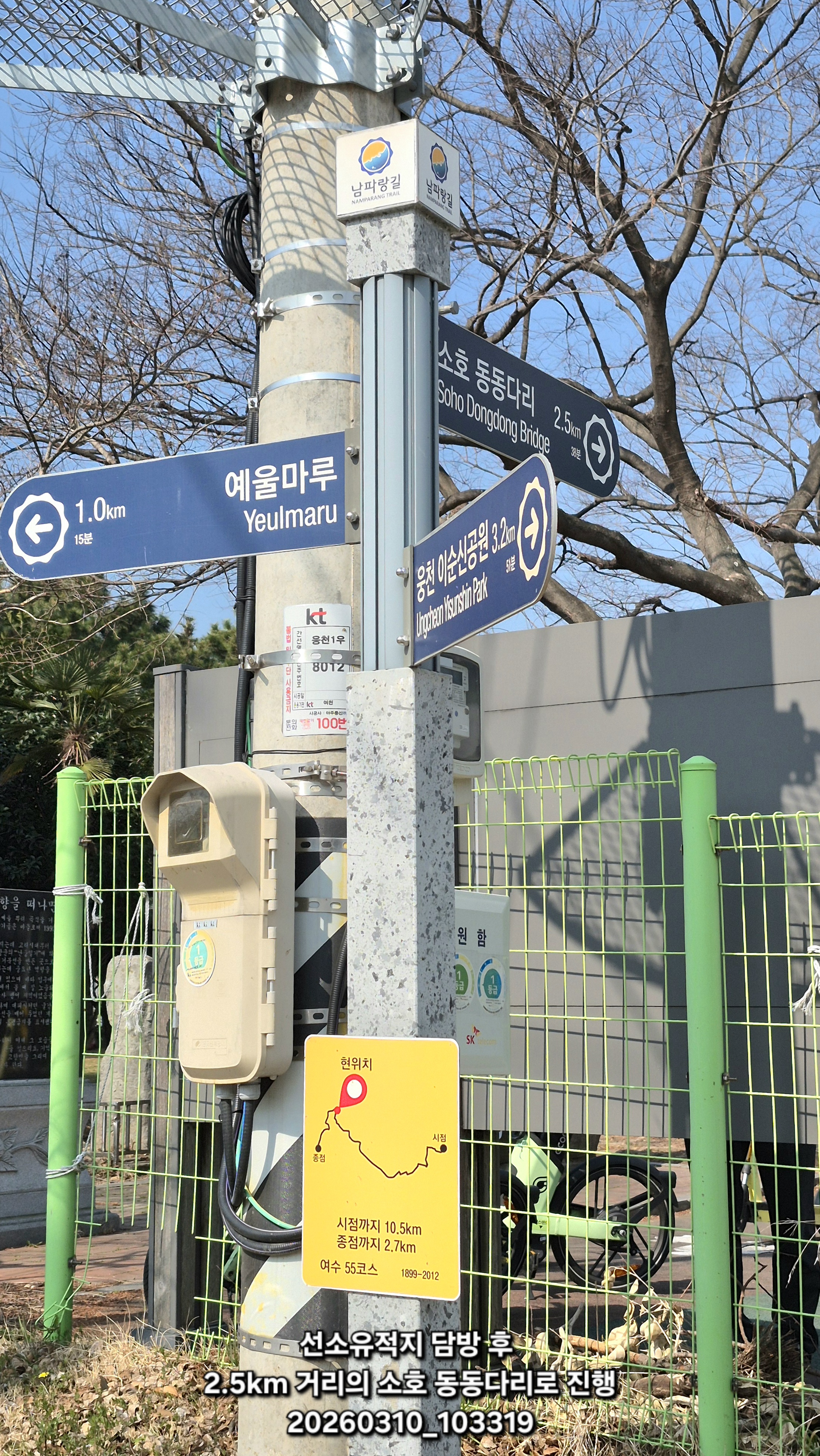 10:33 선소유적지 탐방 후 2.5km 거리의 소호 동동다리로 진행 : 소호 요트경기장 2.7km, 여수항 시점 10.5km
