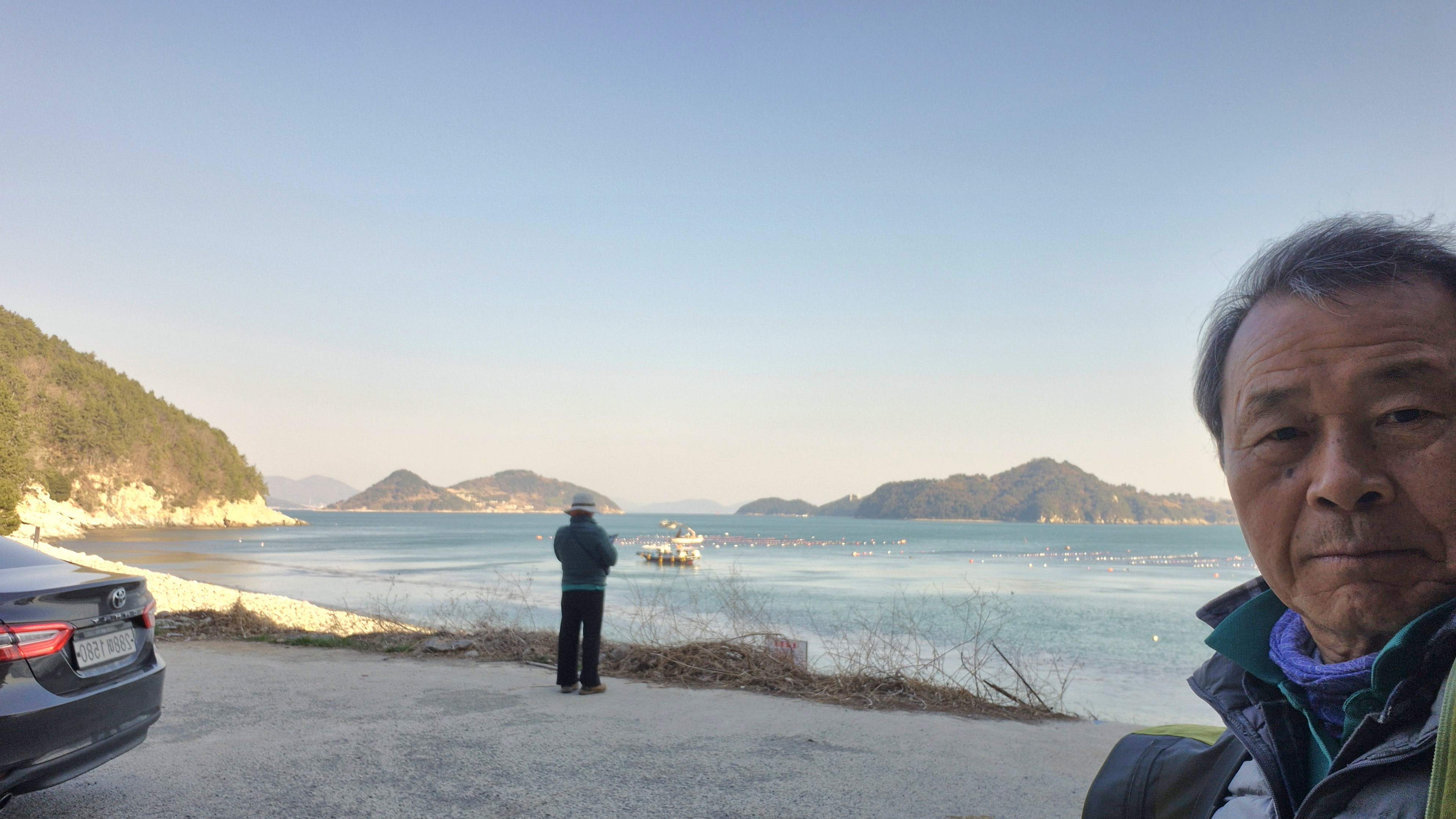07:48 여수 백야도 일주 트레일 위해 백야교 옆 Resort SIRO 주차장에서 봉화산, 고봉산전망대, 여자만 해넘이 전망대, 화백리방파제, 전어양식장을 배경으로 사진 촬영 후 출발