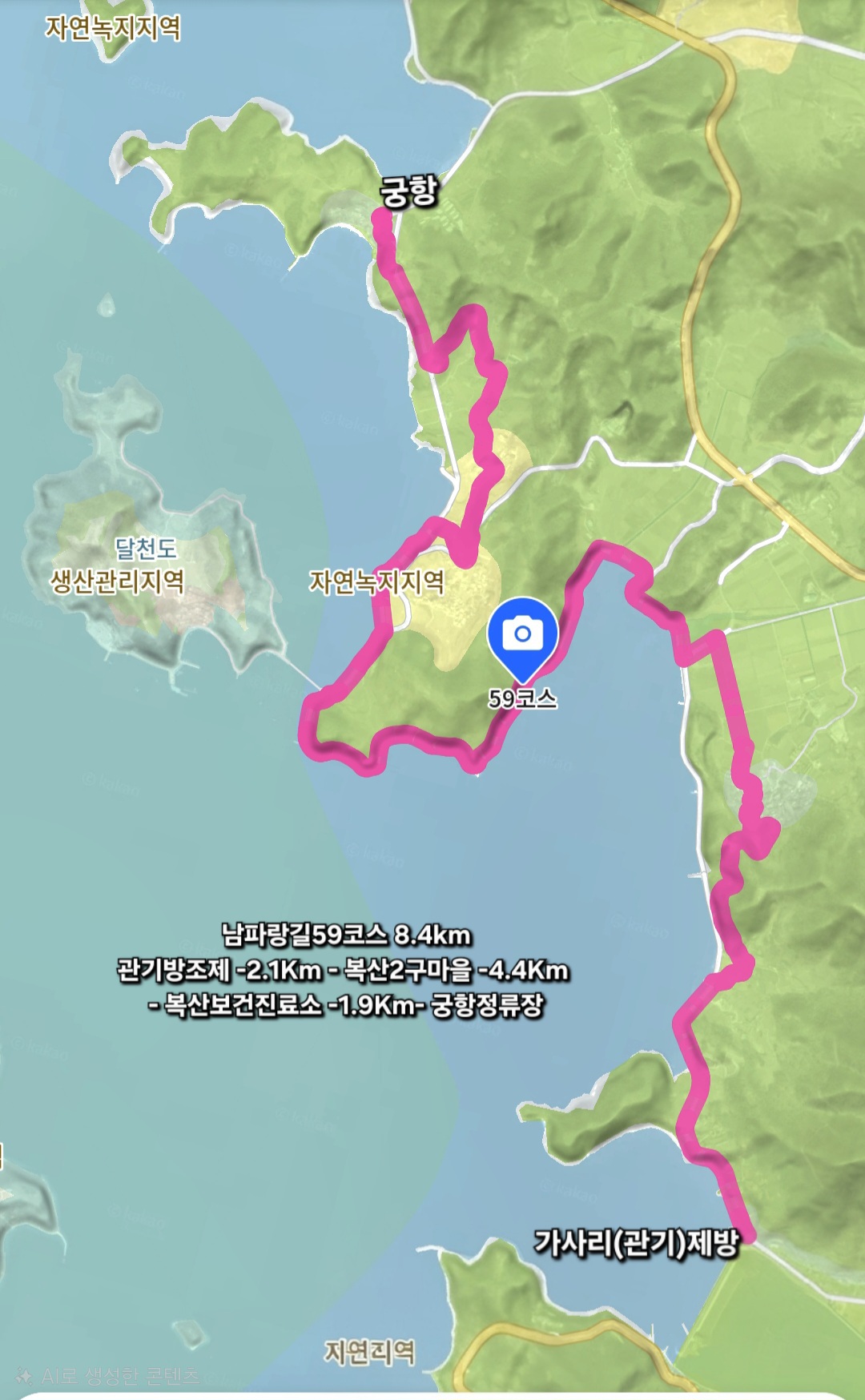 관기방조제 -2.1Km- 복산2구마을 -4.4Km- 복산보건진료소 -1.9Km- 궁항정류장